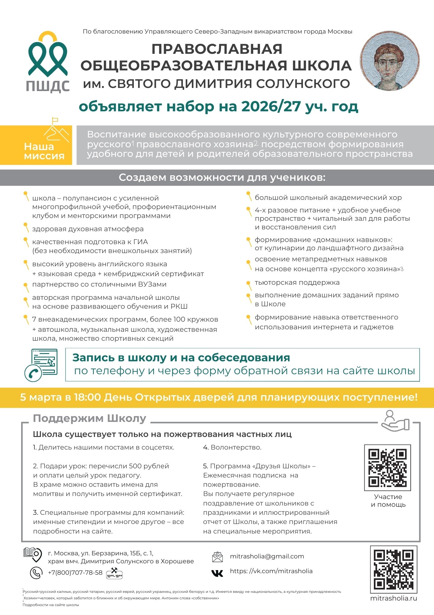 Православная школа имени святого великомученика Димитрия Солунского объявляет набор на 2026/27 учебный год!